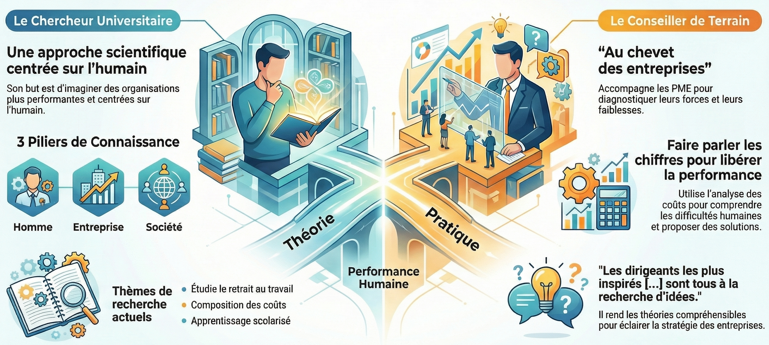 Recherche fondamentale. Une connaissance rigoureuse de la gestion d'entreprise, mais aussi des tendances anciennes et nouvelles de la société, sont des atouts dans une mission de conseil. Mon objectif en tant qu'universitaire en sciences sociales, est de mieux comprendre la vie sociale contemporaine, dont une bonne partie concerne la vie individuelle et collective au travail. L'étude de la nature humaine est ici évidemment un incontournable, notamment lorsqu'il s'agit de comprendre les comportements au travail. Les Hommes sont les mêmes en entreprise qu'en dehors d'elle.